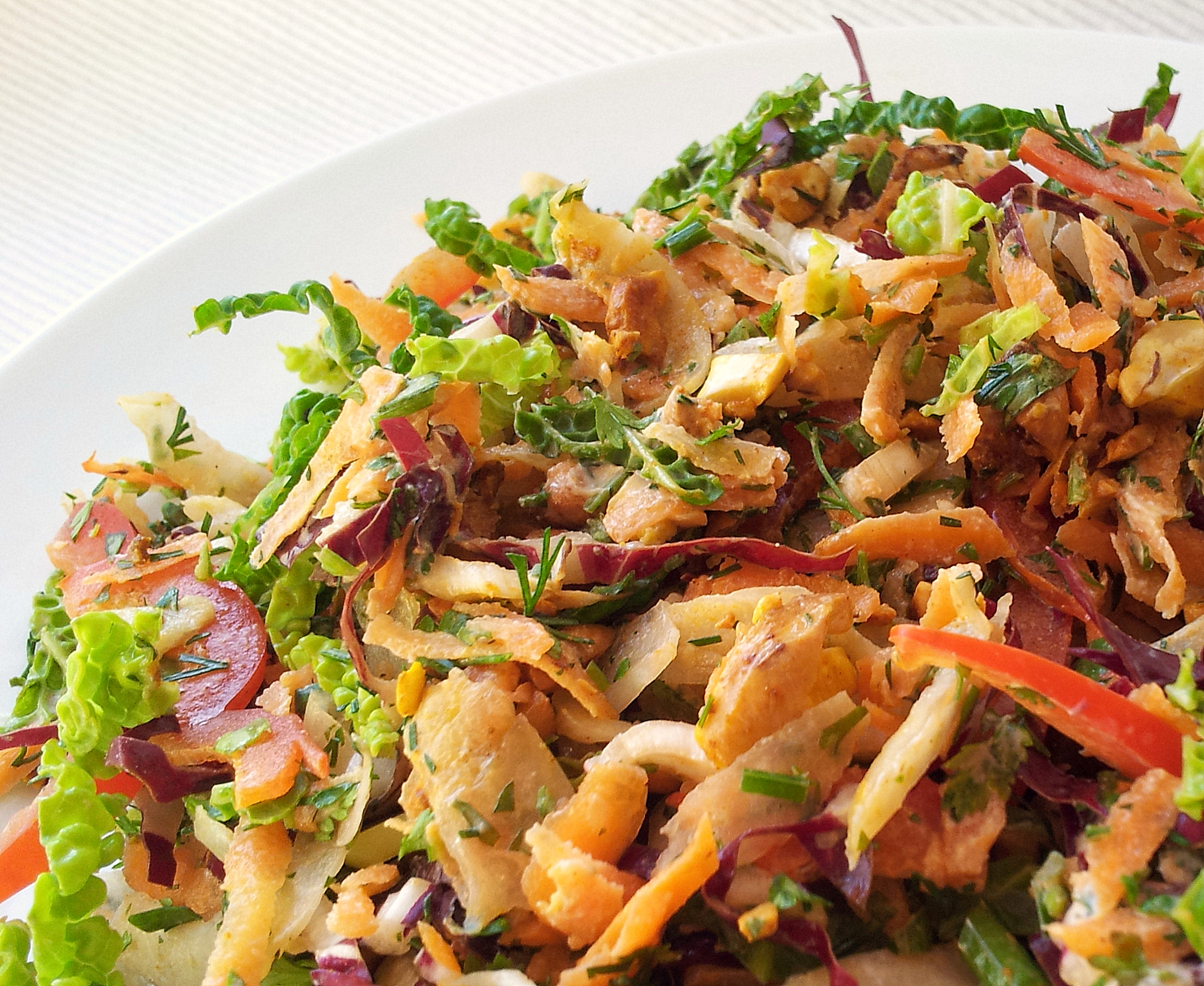 Return the strained carrots and fennel to the bowl, add the cabbage, radicchio, red pepper and chilli, and stir well.