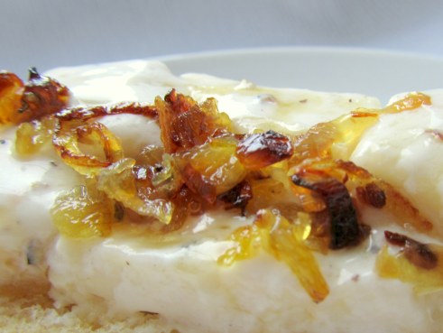 Idiazábal cheese and caramelised onion tapa (adapted from Simone and Inés Ortega’s The Book of Tapas)