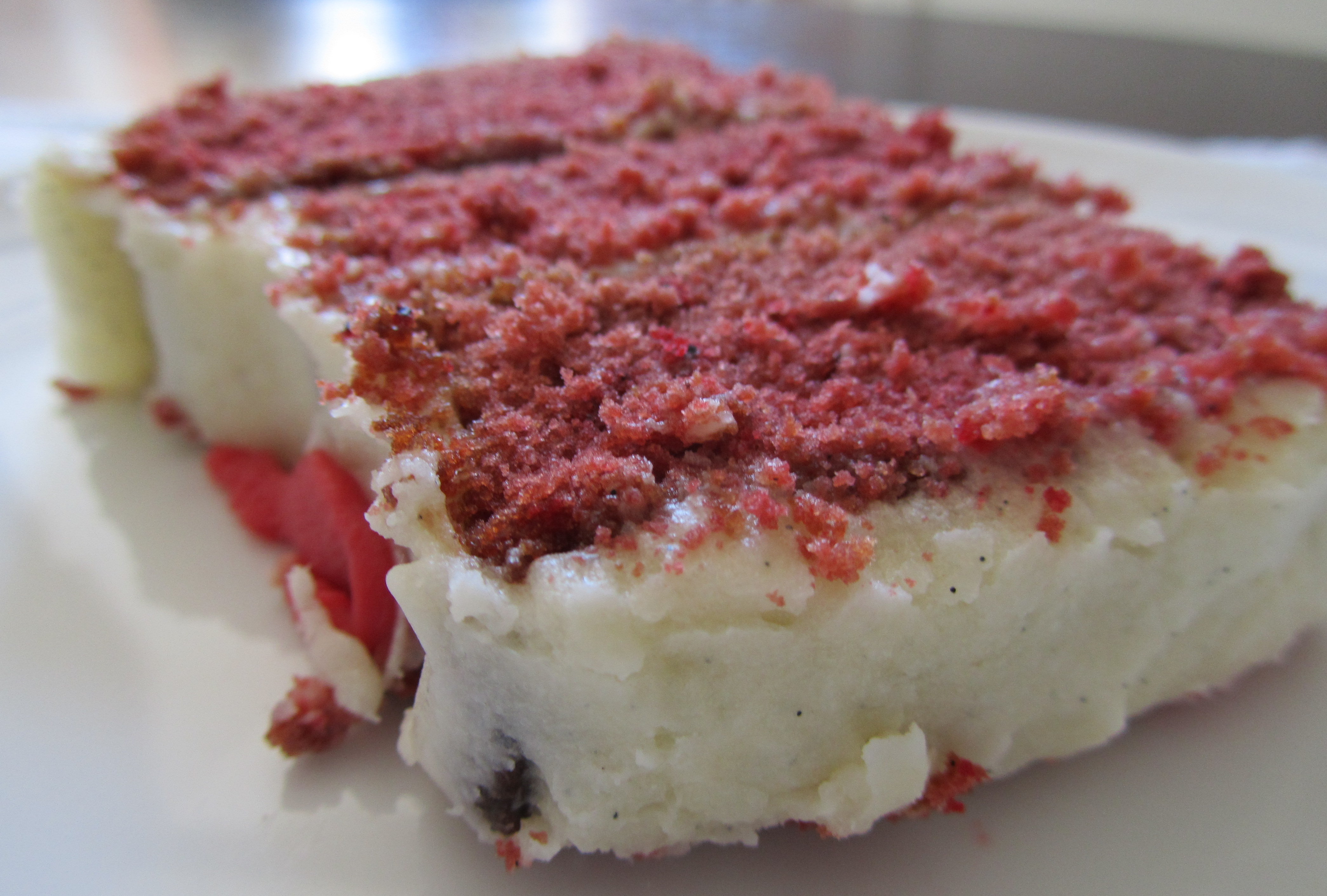 As its own name says, the red velvet cake is red. Red in an unnatural shade of red. In case doubts that it should be red persist, it is layered with white frosting, to make the red go even redder. It is supposed to have a slight taste of cocoa and vanilla, and a velvety texture given by buttermilk. The red color is allegedly the result of the presence of anthocyanin in the cocoa, which becomes red in the presence of an acid, explaining the necessity of adding unusual ingredients in a cake like vinegar and buttermilk. Strictly speaking, the cocoa might turn to a reddish shade and become dark-red-brown…. To get the extra bright red, abundant food dye has to be added. No one knows for sure where the recipe comes from, whether it was created on the South of the United States or it was an experiment gone mad in a Canadian department store. For sure, it seems to be a New World creation, as it is hardly ever seen on European cookbooks. In fact, I cannot remember ever seeing it for sale on this side of the Atlantic patisseries.