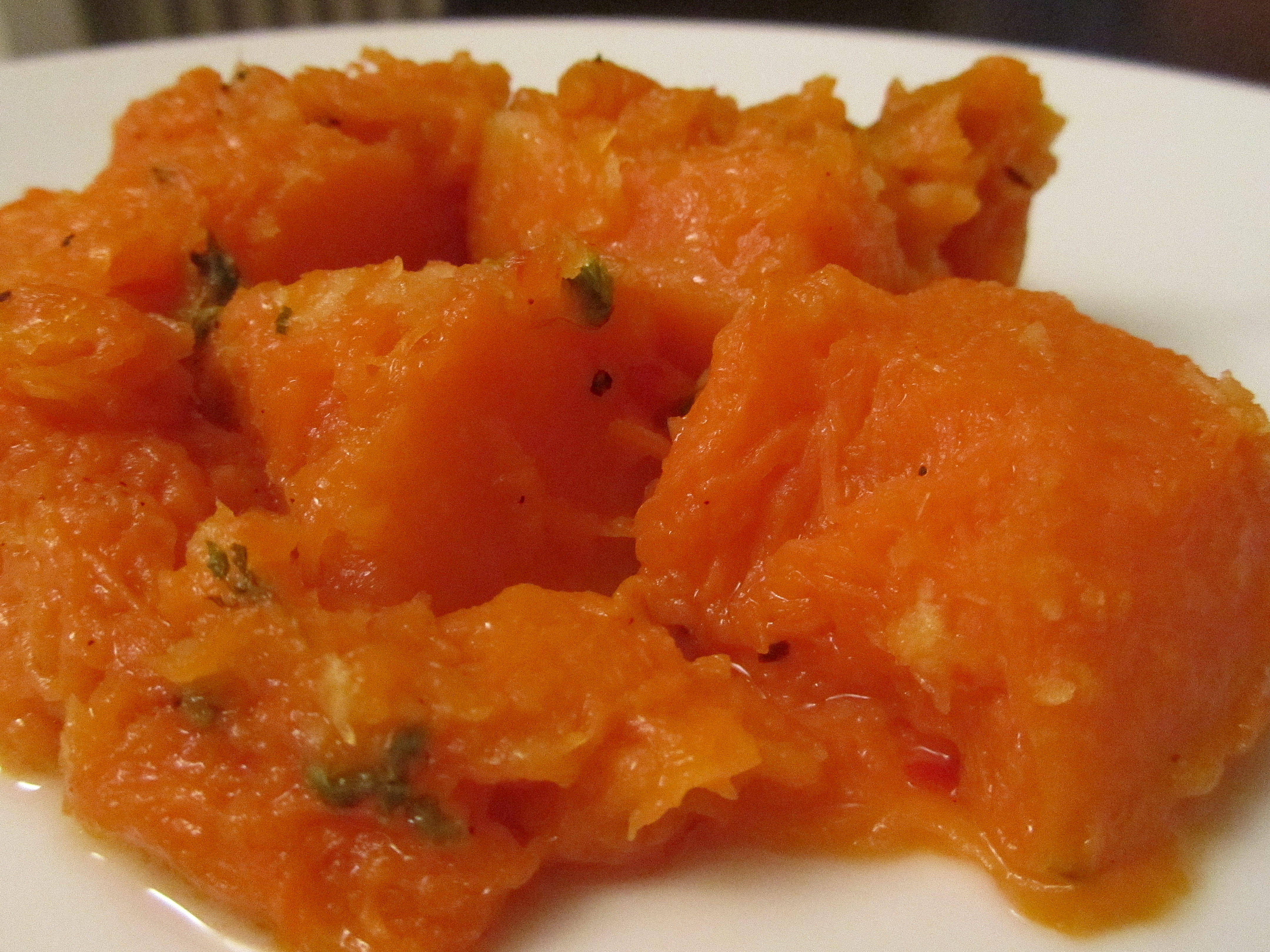 Preheat the oven to 350°F (=175°C). Season the flesh of the pumpkin with salt and pepper and rub with the olive oil. Place the pumpkin pieces on a baking sheet. Add enough water to have about 1cm water in the oven dish 45 to 60 minutes, or until tender.[the recipe called for thyme sprigs to be put under the pumpkin, but I had none at home.]