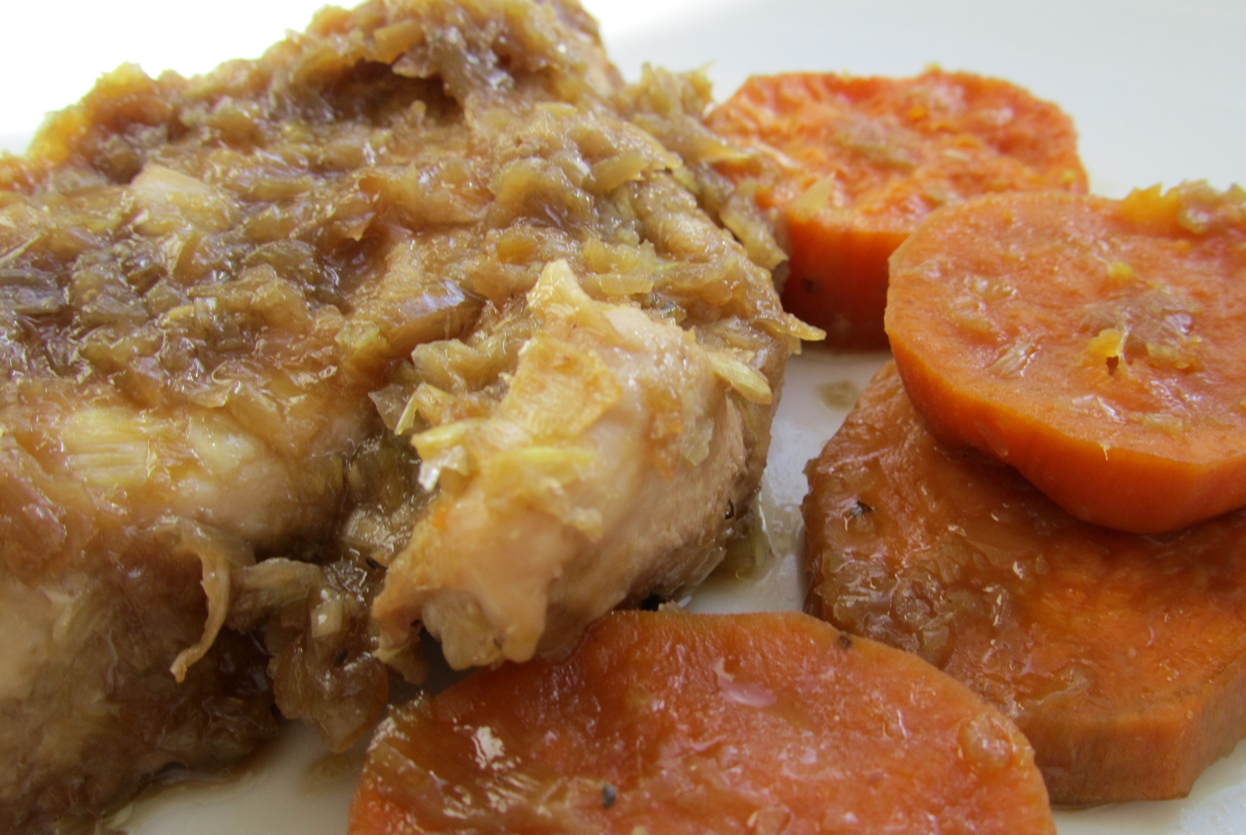 Put the chicken and the sweet potatoes on an oven proof dish and grill until it is golden and cooked.