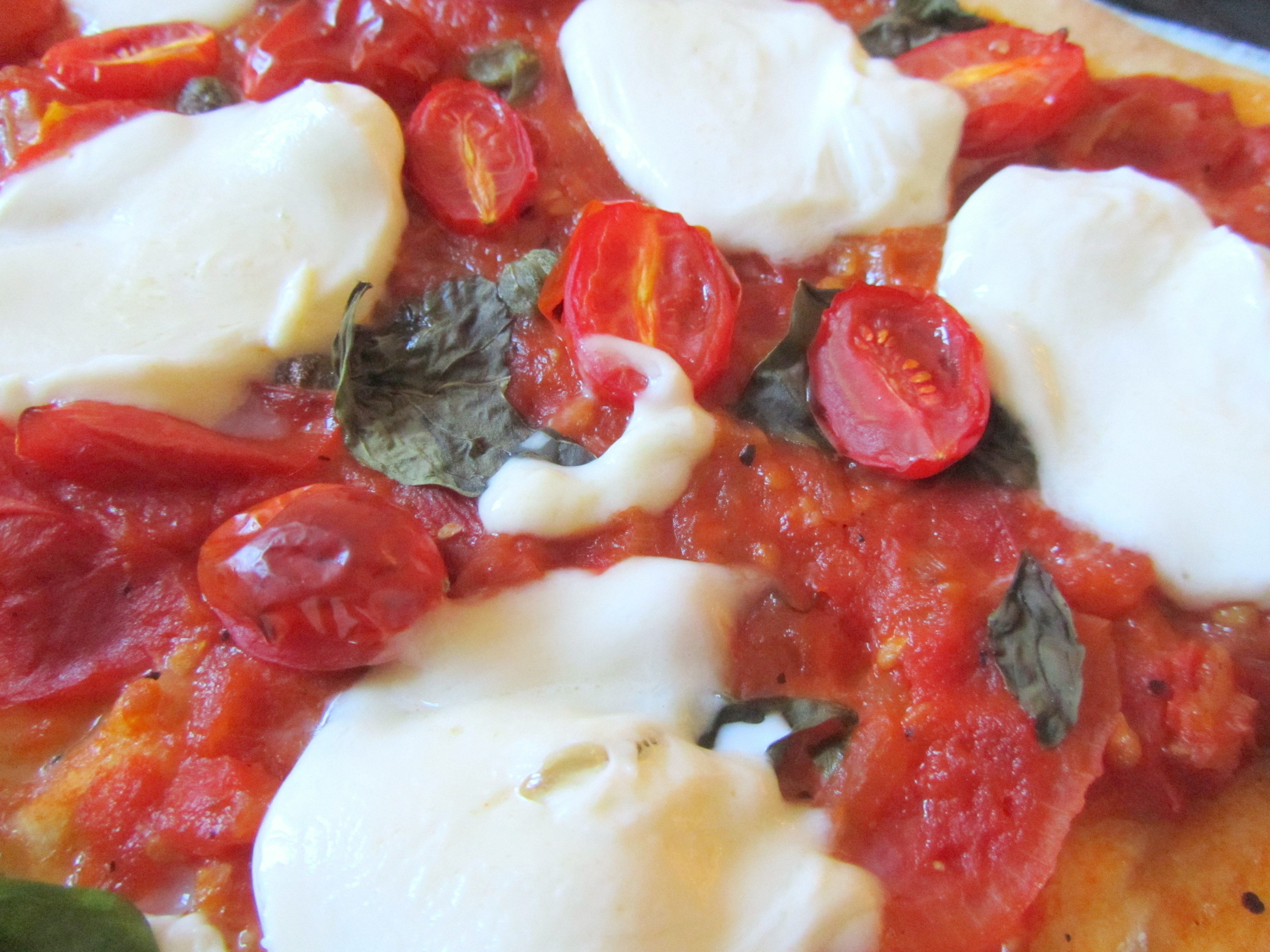 Spread the tomato sauce over the dough, sprinkle with baby capers and scatter over basil leaves. Place cherry tomatoes on top and drizzle with olive oil.